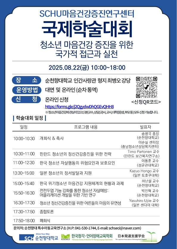 이번 2025년 8월에 연구소 주관 SCHU마음건강증진연구센터 국제학술대회를 개최합니다.
