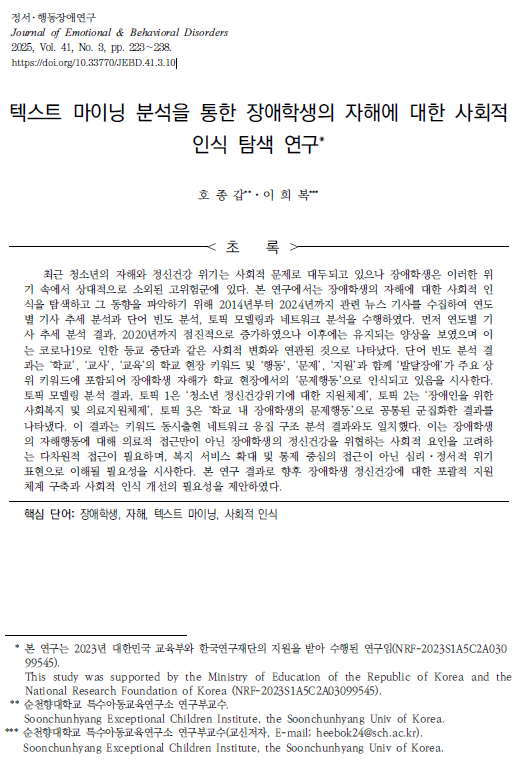 주제어: 장애학생, 자해, 텍스트 마이닝, 사회적 인식